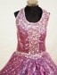 This sparky halter-top neck pageant dress with beading encrusted all-over show off your sparky side. The corset style bodice is finished with a lace up tie back. This sparkly dress will make your little pageant girl a star!