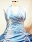 The halter top bodice features pleats and beading curving your perfect figure. The layers of ruffles on the ball gown make the dress look romantic and gorgeous. A lace up back completes the look.