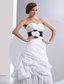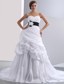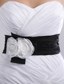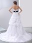 Be the belle on your wedding in this simple yet elegant princess-inspired gown. It has a lovely gathered texture on the bodice and a pleated pattern across the bustline. Two hand made flowers accents at the wide and ruched black waistband define the waist so nice. The floor-length skirt is made from a series of ruffles that combine to create a beautiful silhouette when worn. A beautiful sweeping train trails behind. The back of the dress features a corset-style closure. Simply stunning.