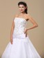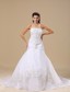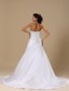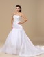 If you're searching for a bridesmaid dress that screams class and sophistication this is definitely one to consider. It's made of a gorgeous taffeta fabric and features strapless gathered bodice that extends below the hips with embroidery to where the long dress flares out wonderfully. It has a zipper up in the back and a chaple train that flows beautifully to the floor. A simple dress of understated elegance perfect for any member of your wedding party.