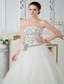 This is a style sure to strike! The luxurious design lies on the details all over the dress. The strapless form-fitted bodice covered with swirling lines of shimmery crystals not only curves your slim waistline, but also show off your distinctive shoulders. A girly bowknot and waistband made from beaded chain make a soft sense. The soft and long A-line skirt is flowy and shinning, made from lightweight materials in pleats and folds with floral sequin all over, that will push you to be the lightspot when you move. A inspiring court train and exquisite lace up tie back completes the perfect design, and it will completes your dream as well when you get it!
