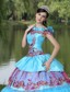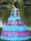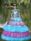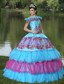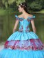 Off Shoulder Tiered Appliques Blue and Pink Quinceanera Dress