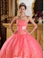 Watermelon Red Ball Gown Strapless Appliques Organza Quinceanera Dress MDCQDZY099